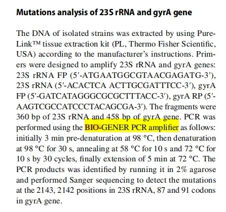 提取分離菌株的DNA,設計引物用于擴增23S rRNA 和 gyrA 基因。使用 BIO-GENER(柏恒科技) PCR 擴增儀進行PCR擴增,最后對PCR 產物進行鑒定,并進行 Sanger 測序以檢測 23S rRNA 中 2143、2142 位、gyrA 基因中 87 和 91 位密碼子的突變。